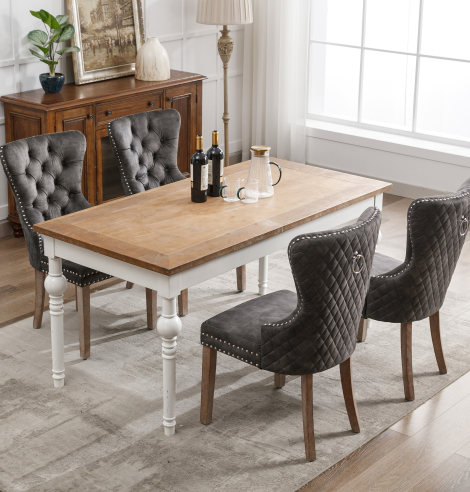 Distressed white frame + tufted upholstered chairs, retro dining style